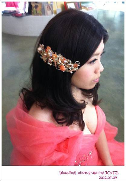 第四套造型是橘紅色的澎禮服,原本的造型比較清湯掛麵,小黑一看到我就面有難色,又問我;喜歡嗎? 這次我有遲疑了,潔西也問我妳真的喜歡嗎? 後來在大家的逼問下,我只說了還好~